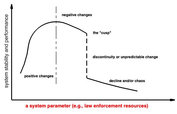 In my post, I presented a few examples that skirt the edges of Catastrophe Theory, a offshoot of systems theory that looks at multi-parametric systems that experience small but continuous changes to multiple variables. As the changes occur, the behavior of the entire system begins to adapt—at first in small increments. and then more quickly as time passes. If the “small” changes modify effective societal parameters in a way that leads to bad outcomes, the system becomes increasingly unstable as multiple aspects of the system are effected by each parameter.